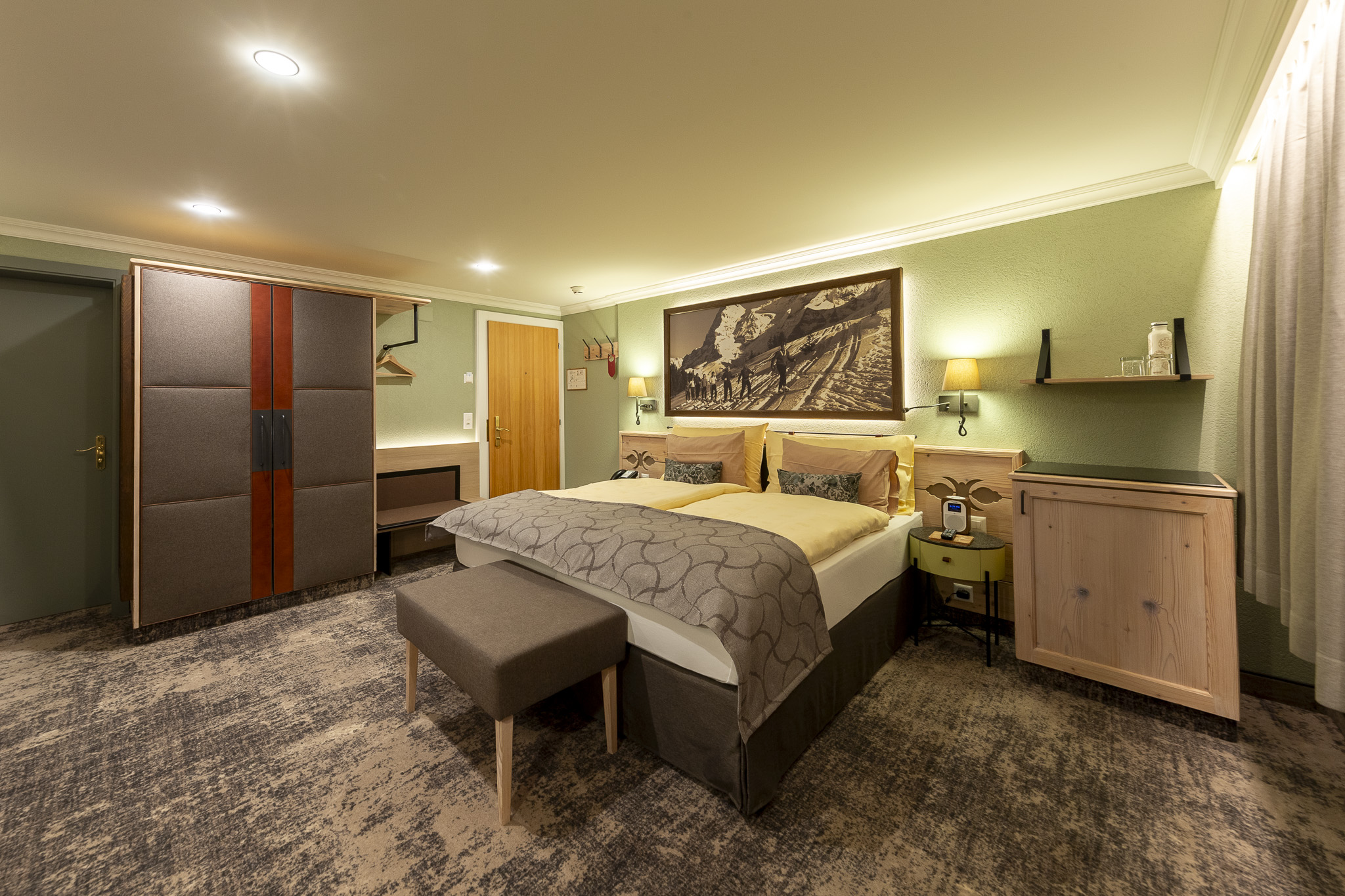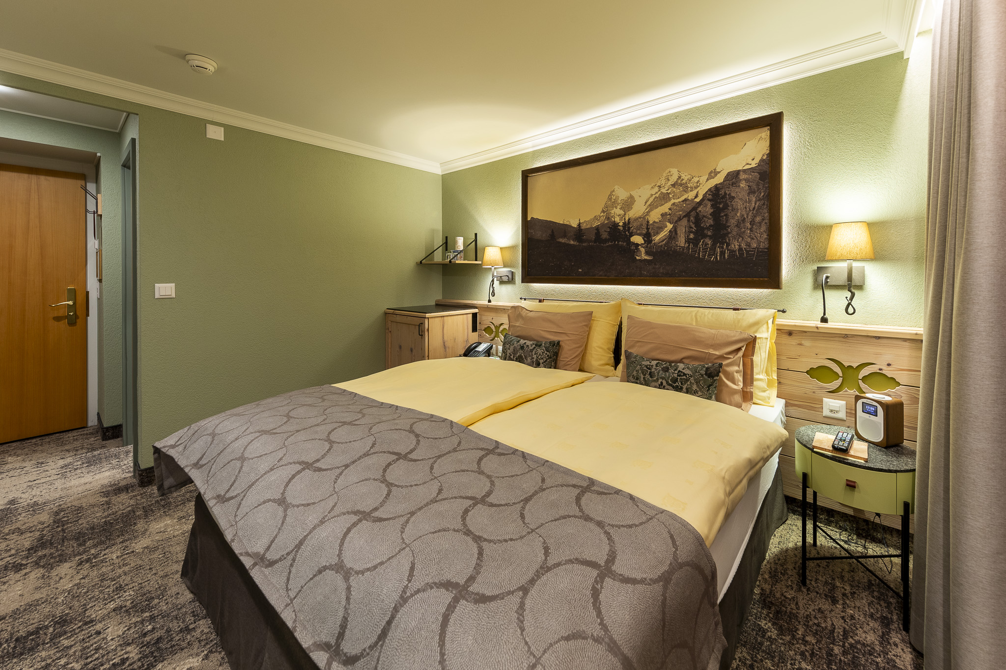 Ein paar Elemente der bestehenden Möblierung sind übernommen und mit neuen Möbeln erweitert und ergänz worden. Mit dem neuen Beleuchtungs- und Materialkonzept wirken die Zimmer hell und freundlich, dass man die einzigartige Aussicht auf den Eiger schon fast vergisst. Die Eröffnungstermine waren bereits vor dem Baustart definiert, was die Zeit zu einem spannenden Gegner machte. Dank der guten Zusammenarbeit mit den einheimischen Gewerben sind diese Herausforderungen zu meistern gewesen.