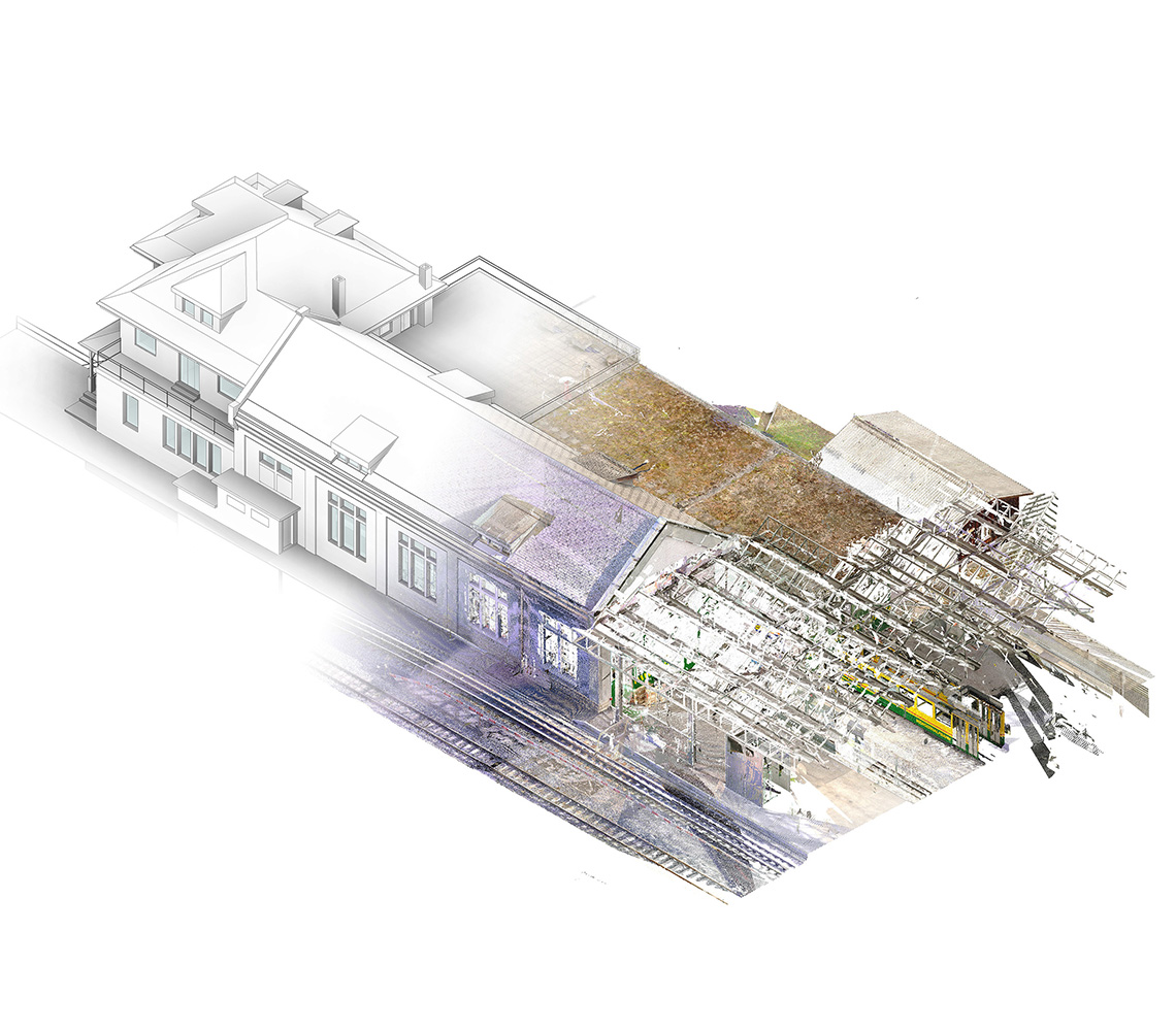 Im Rahmen einer Brandschutzanalyse vom Bahndepot in Lauterbrunnen wurde das gesamte Gebäude in 3D erfasst. Die Aufnahmen wurden extern in Auftrag gegeben. Dafür kamen die beiden Messmethoden Laserscanning und Tachymetrie zum Einsatz. Die Tachymetrieaufnahmen dienten zur Georeferenzierung der rund 120 Scans. Anschliessend wurde ein BIM-Modell mit dem Programm REVIT erstellt und dient nun als Grundlage für weitere Bearbeitungsschritte.