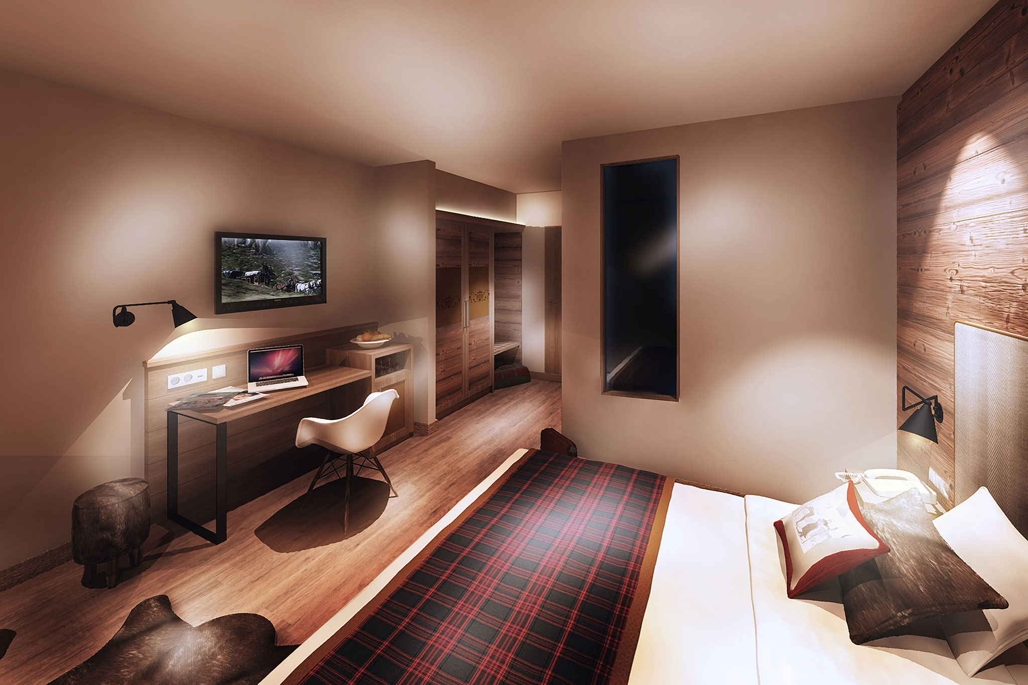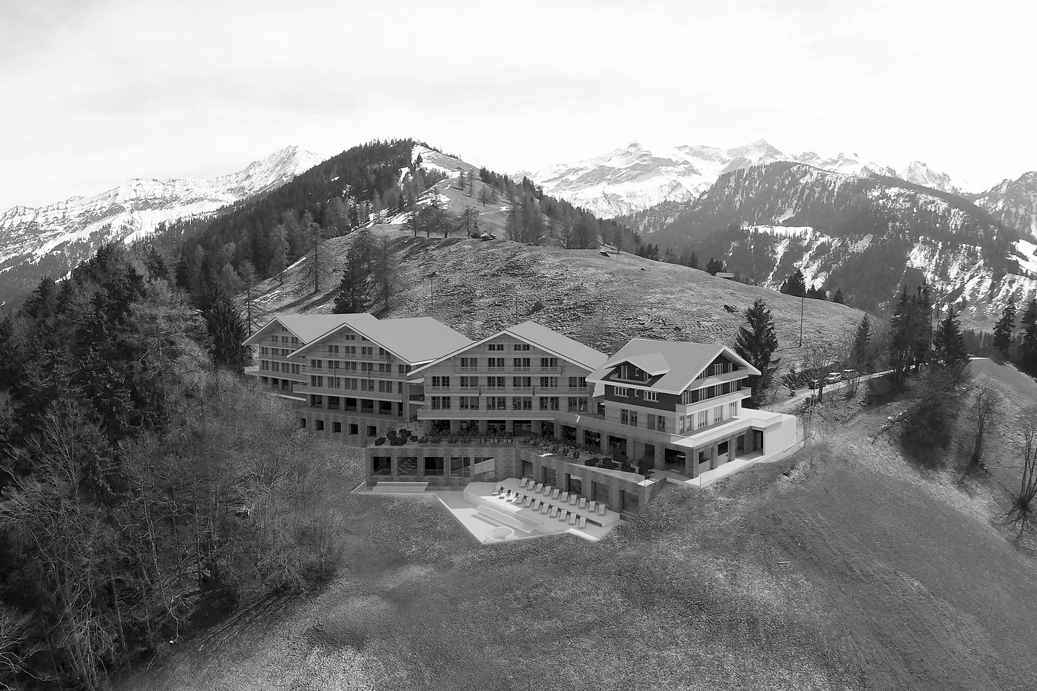Das Projekt Alpentherme soll sich in das Ortsbild einfügen. Mit einer dreiteiligen Erweiterung des bestehenden Chalets entstehen Volumen, welche es ermöglichen, den Flächenanforderungen eines modernen Wellness & Seminarhotel Rechnung zu tragen. Zum anderen betten sich die Körper optimal in das Landschaftsbild ein. Die traditionellen Werte, welche die Region um Aeschiried prägen, definieren den Charakter der Alpentherme. Holz und Stein werden zum zentralen Element und übermitteln die Ruhe und Kraft des Ortes.