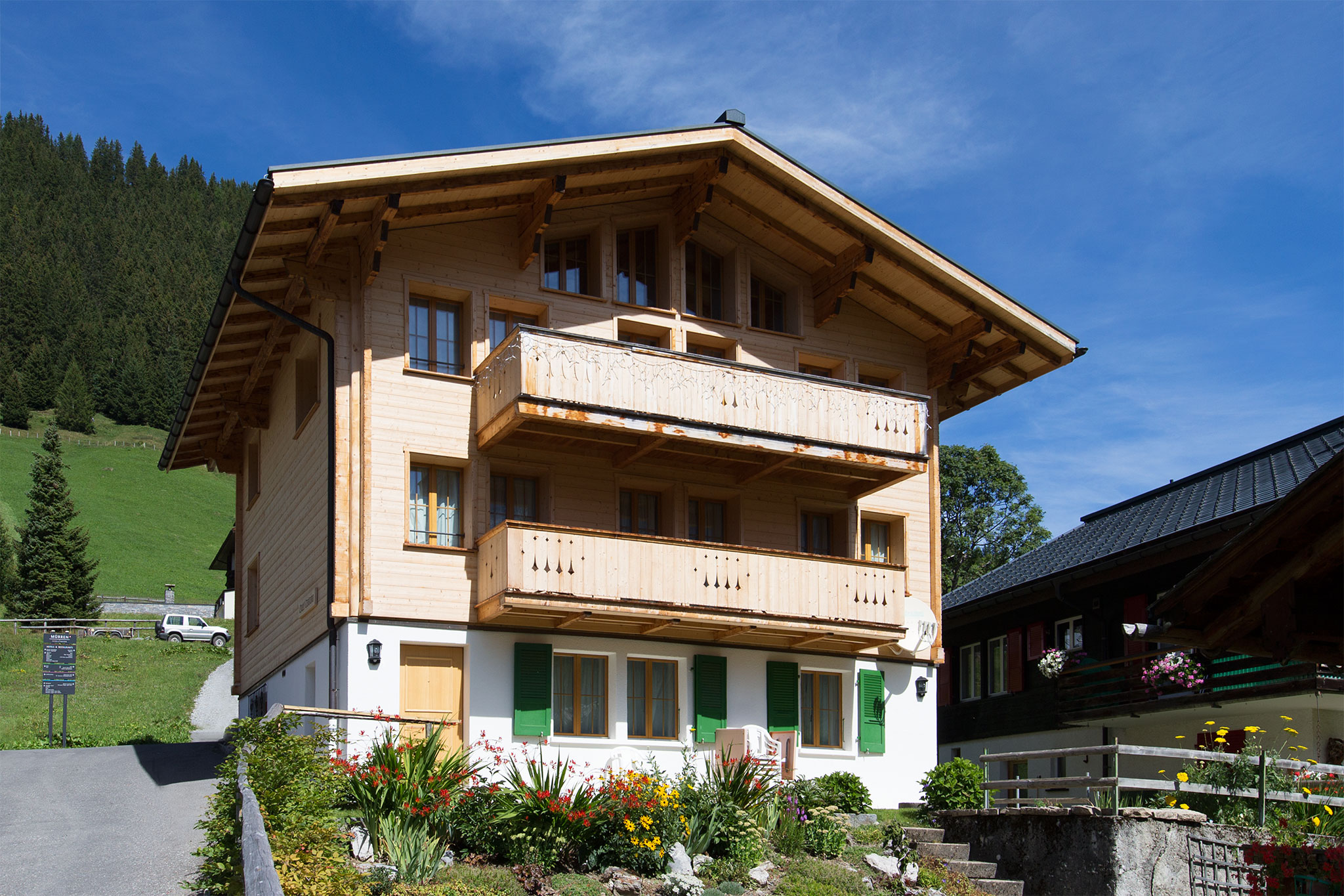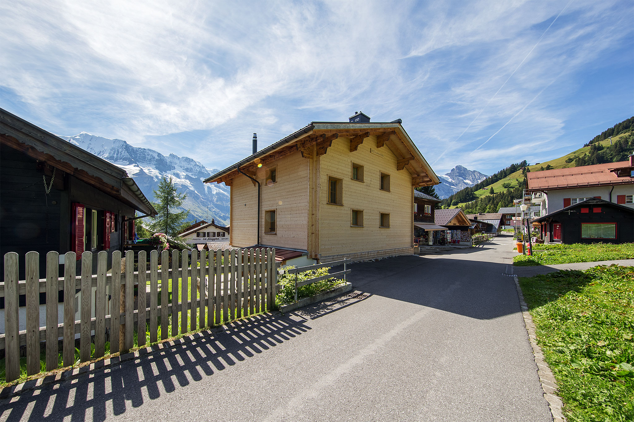 Das Chalet „Bim Hitti" wurde im Jahr 1963 von einem kleinen Häuschen zu einem stattlichen Mehrfamilienhaus umgebaut. Zu dieser Zeit wurde das Gebäude ostseitig fast um das doppelte Volumen vergrössert. Die bestehenden Flecken, welche aus den heutigen Fassaden hinaus ragen, erinnern an die Konstruktion und an die Grösse des ursprünglichen Baus. Es entstand ein grosszügiges Ferienhaus, welches vorwiegend in den Wintermonaten bewohnt wird.
